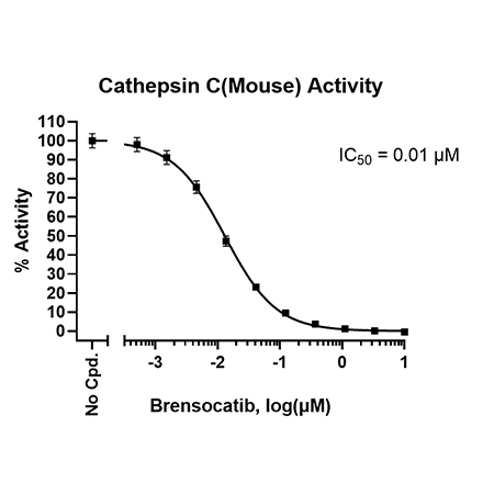 The Cathepsin C (DPPI) Inhibitor Screening Assay Kit (Mouse) is designed to measure the protease activity of Cathepsin C, also known as DPPI (dipeptidyl peptidase I) for screening and profiling applications. This kit comes in a convenient 96-well format, with enough recombinant mouse cathepsin C (procathepsin C), substrate and buffer for 100 reactions. Cathepsin C, also known as DPPI (dipeptidyl peptidase I), is a lysosomal aspartic protease with dipeptidylpeptidase activity over a broad range of substrates. It is mostly found in lysosomes, where it degrades intra- and extra-cellular proteins, regulates cell death, and plays a role in inflammation. It can activate proteins such as elastase, and granzyme A and B. It is found at high levels in several cancer types, and it has been linked to an increase in metastasis and angiogenesis. Its role in cancer has made it an attractive target in oncology, with active development of specific, membrane permeable inhibitors.