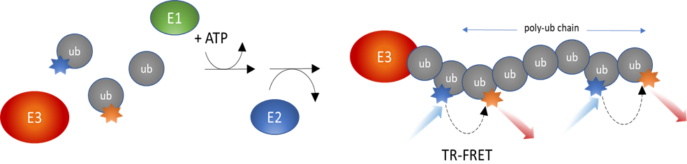 The TRAF6 intrachain TR-FRET Assay Kit is a sensitive high-throughput screening (HTS) TR-FRET Assay Kit, designed to measure TRAF6 auto-ubiquitination activity in a homogeneous 384 reaction format. It utilizes a Europium-labeled ubiquitin (Ub) donor as well as Cy5-labeled Ub acceptor to complete the TR-FRET pairing. Since both the TR-FRET donor and acceptor are incorporated into poly-ubiquitin chains formed on TRAF6, this assay measures poly-ubiquitination. As a homogeneous assay, it requires no time-consuming washing steps, making it especially suitable for HTS applications as well as real-time analyses.