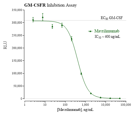 This Granulocyte-Macrophage Colony-Stimulating Factor Receptor (GM-CSFR) assay kit is an all-inclusive luciferase reporter assay system that includes, in addition to GM-CSFR Reporter Cells, optimized culture medium for use in reviving the cryopreserved cells, a culture medium for use in preparing test sample treatments, the physiological activator GM-CSF as a positive control, Luciferase Detection Reagents, a cell culture-ready assay plate, and a detailed protocol. INDIGO's cell-based reporter assays allow scientists to detect any biological activity that their test samples may exert against a specific receptor present in the cell. They utilize firefly luciferase reporter gene technology which provides superior precision and sensitivity. Since the receptor binding controls the expression of the luciferase reporter gene, luciferase activity in the cells can be correlated directly with the activity of the receptor. The strength of an interaction of a chemical with the target receptor is quantified using a luminometer to measure the level of light emitted. Thaw, Feed, Dose, Read Fast, reproducible, easy-to-analyze results are only four steps away Many luciferase reporter assays require the user to grow their own cells and take time to optimize the results. INDIGO's reporter cells contain the receptor of interest and the luciferase reporter gene. Reporter cells have been optimized to provide extreme sensitivity to quantify even small changes in receptor activity. With INDIGO's cell-based reporter assays, the process is as easy as Thaw, Feed, Dose, and Read. GM-CSFR Reporter Cells GM-CSFR Reporter Cells are prepared using INDIGO's proprietary CryoMite(TM) process. This proprietary cryopreservation process, enables long-term preservation of our unique reporter cells, so we can ship our cryopreserved reporter cells and assay reagents to you via overnight delivery, for your immediate use. Or, you can store the assay kits at -80°C. Once thawed, reporter cells are ready for immediate use so there is no need to take time on intermediate spin-and-wash steps, viability determinations, or cell titer adjustments. GM-CSFR Luciferase Reporter INDIGO's GM-CSFR assay kits feature a luciferase detection reagent specially formulated to provide stable light emission between 5 and 90+ minutes after initiating the luciferase reaction. Incorporating a 5-minute reaction-rest period ensures that light emission profiles attain maximal stability, thereby allowing assay plates to be processed in batch. By doing so, the signal output from all sample wells, from one plate to the next, may be directly compared within an experimental set. Human GM-CSFR Background: The glycoprotein, granulocyte-macrophage colony-stimulating factor (GM-CSF) was originally defined as a growth factor that induces the differentiation and proliferation of myeloid progenitors in response to stress, infections, and cancers. The activity of GM-CSF is mediated through binding interactions with the GM-CSF Receptor (GM-CSFR, also known as CSF2R). GM-CSFR is expressed in myeloid cells and some non-hematopoietic cells as a heterodimer comprising a ligand-specific alpha subunit and a beta subunit. The beta subunit is also shared with the heteromeric IL-3 and IL-5 receptors. GM-CSF is known to play an important role in cancer development and progression. GM-CSF stimulates the production and maturation of neutrophils, macrophages and dendritic cells that mediate the initial host responses to cancers. However, a fine balance exists. Too little GM-CSF prevents the appropriate production of innate immune cells and subsequent activation of adaptive anti-cancer immune responses. Conversely, too much GM-CSF production can exhaust immune cells and promote cancer growth. GM-CSF is also commonly described as a cytokine, and is known to contribute to chronic inflammatory diseases by stimulating the activation and migration of myeloid cells to inflammation sites. An imbalance in GM-CSF production and signaling has been associated with autoimmune diseases like multiple sclerosis (MS), rheumatoid arthritis (RA), myasthenia gravis (MG), inflammatory bowel disease (IBD) and systemic lupus erythematosus (SLE). Consequently, GM-CSF and its specific receptor, GM-CSFR, command considerable interest in therapeutics development and drug safety screening. JAK2 dependent phosphorylation and activation of the transcription factor STAT5 is a prominent outcome of GM-CSFR activation, and it is the signaling pathway exploited by the reporter cells included in this assay kit. Specifically, INDIGO's Reporter Cells contain the luciferase reporter gene functionally linked to an engineered minimal promoter sequence with upstream tandem STAT5 genetic response element (GRE) sequences. GM-CSF activates the GM-CSFR in a dose-dependent manner, thereby triggering the JAK2/STAT signal transduction cascade. Activated STAT5 binds to its consensus GREs to initiate the formation of a complete transcription complex that drives expression of the Luc reporter gene. Therefore, quantifying changes in luciferase activity from peptide-, drug- or antibody-treated reporter cells relative to that of 'untreated' cells provides a sensitive, dose-dependent surrogate measure of changes in the activity of GM-CSFR. Protein function: Low affinity receptor for granulocyte-macrophage colony- stimulating factor. Transduces a signal that results in the proliferation, differentiation, and functional activation of hematopoietic cells. [The UniProt Consortium]