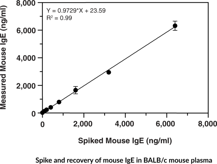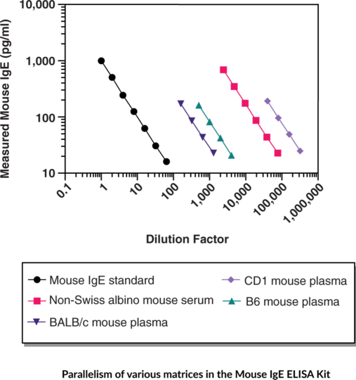 Cayman's Mouse IgE ELISA Kit is an immunometric (i.e. sandwich) assay that can be used for the quantification of mouse IgE in mouse plasma, serum, and urine, and cell culture media. The standard curve spans the range of 0-1,000 pg/ml, with a lower limit of detection (LLOD) of 4.8 pg/ml.