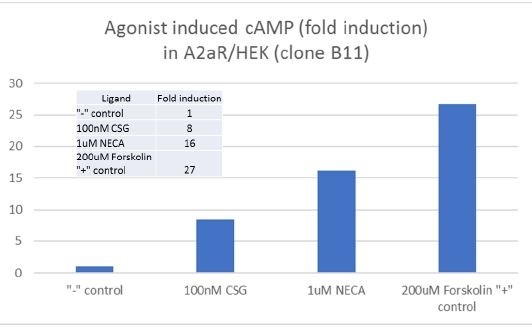 Adenosine A2a receptor (A2aR or ADORA2A) stably expressed in HEK-293 reporter cells with a cAMP-responsive luciferase construct (CRE/CREB Luc, BPS Bioscience, #60515). A2aR is a member of the seven transmembrane G protein-coupled receptor (GPCR) family. The activity of A2aR is mediated by Gs protein which activates adenylyl cyclase, resulting in the synthesis of intracellular cAMP. The level of cAMP correlates with the respective adenosine (agonist) level, and the cell line can be used to measure the EC50 and IC50 values of A2aR agonists or antagonists in a quantitative manner. Binding of extracellular adenosine ligand or its stable analog NECA (5'-(N-Ethylcarboxamido) adenosine) to the A2aR expressed on the surface of this cell line can also produce luciferase reporter signal for qualitative measurement.