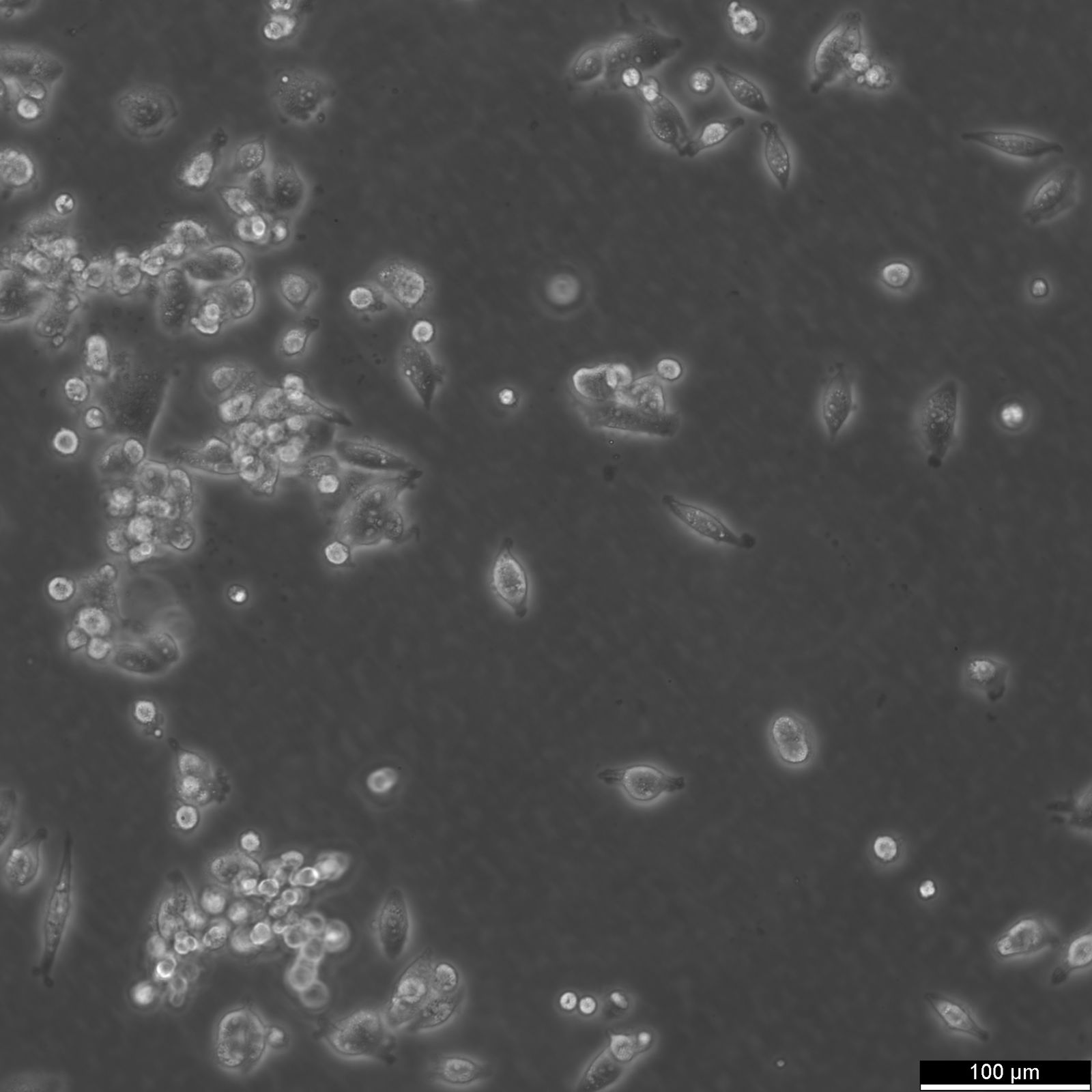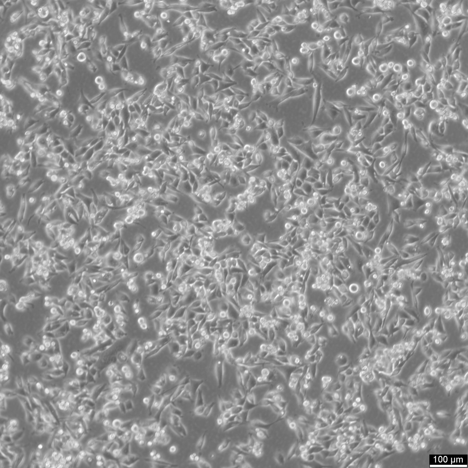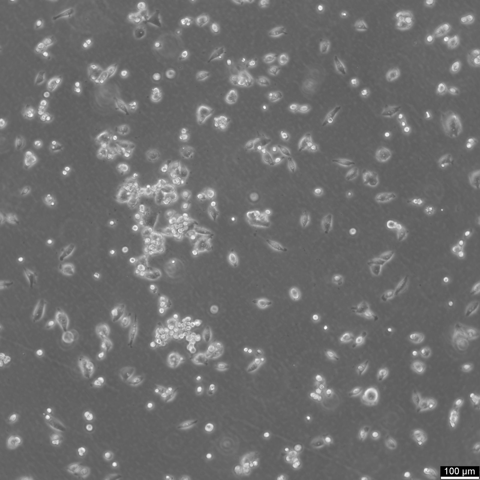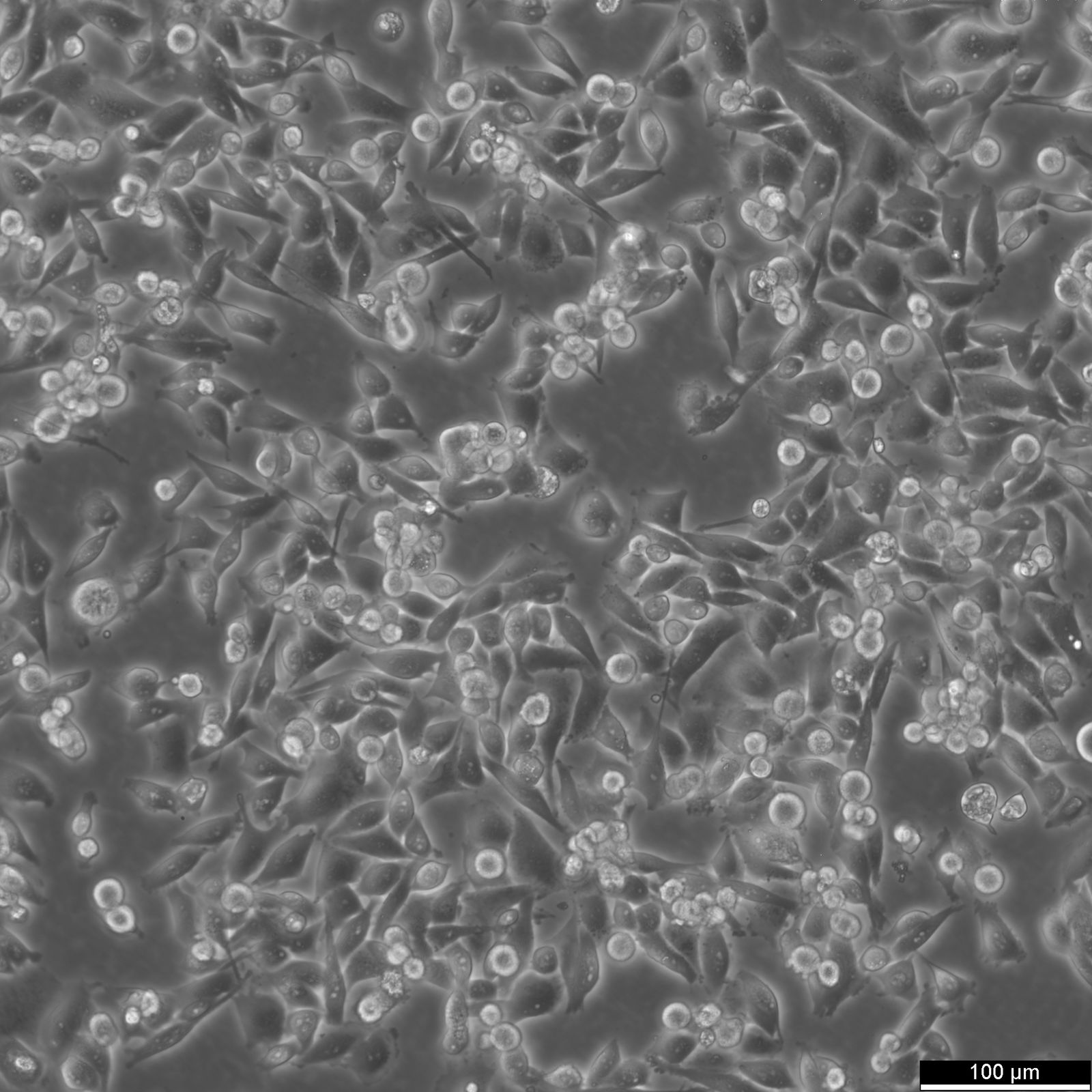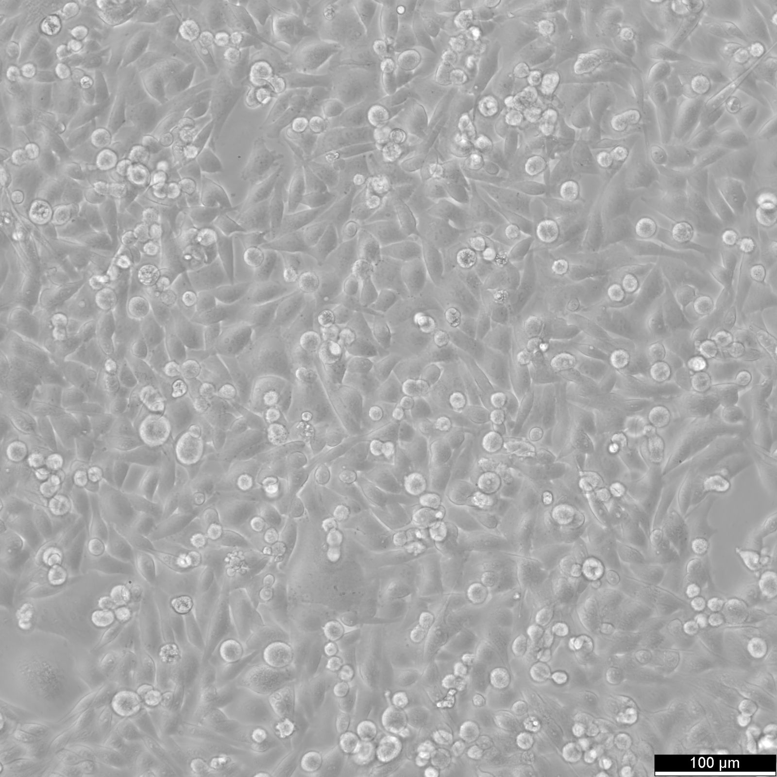 Categories: Lung cancer cell lines Description: The Calu-6 cell line is a human non-small cell lung carcinoma (NSCLC) cell line derived from the pleural effusion of a 61-year-old male patient. Established in 1975, this cell line has been a critical model in lung cancer research. Calu-6 cells exhibit a distinct epithelial morphology and have been used extensively to study the biology of lung cancer, including mechanisms of metastasis, drug resistance, and the tumor microenvironment. These cells are particularly noted for their ability to form tumors in xenograft models, which makes them highly valuable for in vivo studies of tumor growth and response to therapeutics. Calu-6 is characterized by a high level of KRAS mutation, common in NSCLC, and provides a relevant model for studying the role of this oncogene in lung cancer. The cell line also displays several cytogenetic anomalies typical of cancer cells, such as complex karyotypes and aneuploidy, which contribute to its use in genetic studies. Research utilizing the Calu-6 cell line has helped in understanding the cellular mechanisms of lung cancer and in the development of therapeutic strategies. Its robust growth in culture and the ability to mimic clinical aspects of lung cancer make it an indispensable resource in oncological research. Organism: Human Tissue: Lung Disease: Adenocarcinoma Metastatic Site: Pleural effusion Synonyms: CaLu-6, CALU-6, Calu.6, Calu 6, Calu6, CALU6, CaLu-06 Age: 61 years Gender: Female Ethnicity: Caucasian Morphology: Epithelial-like Growth Properties: Adherent Citation: Calu-6 (Cytion catalog number 300135) Biosafety Level: 1 Ncbi_ Taxid: 9606.0 Cellosaurus Accession: CVCL_0236 Protein Expression: p53 negative Isoenzymes: Me-2, 1, PGM3, 1, PGM1, 2, ES-D, 1, AK-1, 1, GLO-1, 2, G6PD, B, Phenotype Frequency Product: 0.0031 Tumorigenic: Yes, in nude mice. Forms poorly differentiated carcinoma Mutational Profile: CaLu-6 cells carry a mutation in KRAS codon 61, c.181C>A p.(Gln61Lys). NRAS of BRAF mutation was not detected. Karyotype: The stemline chromosome number is hypotriploid and the 2S component occurred at 5.8%. Modal chromosome number is 59. Fourteen marker chromosomes (constitutive) were common to most S metaphases. No Y chromosome was detected in the QM stained preparation. Culture Medium: EMEM (MEM Eagle), w: 2 mM L-Glutamine, w: 2.2 g/L NaHCO3, w: EBSS (Cytion article number 820100a) Supplements: Supplement the medium with 10% FBS and 1% NEAA Dissociation Reagent: Accutase Subculturing: Remove the old medium from the adherent cells and wash them with PBS that lacks calcium and magnesium. For T25 flasks, use 3-5 ml of PBS, and for T75 flasks, use 5-10 ml. Then, cover the cells completely with Accutase, using 1-2 ml for T25 flasks and 2.5 ml for T75 flasks. Let the cells incubate at room temperature for 8-10 minutes to detach them. After incubation, gently mix the cells with 10 ml of medium to resuspend them, then centrifuge at 300xg for 3 minutes. Discard the supernatant, resuspend the cells in fresh medium, and transfer them into new flasks that already contain fresh medium. Seeding Density: 2 x 104 cells/cm2 will result in a 90% confluent monolayer in about 4 days Fluid Renewal: 2 to 3 times per week Post Thaw Recovery: After thawing, plate the cells at 5 x 104 cells/cm2 and allow the cells to recover from the freezing process and to adhere for at least 48 hours. Freeze Medium: As a cryopreservation medium, use complete growth medium (including FBS) + 10% DMSO for adequate post-thaw viability, or CM-1 (Cytion catalog number 800100), which includes optimized osmoprotectants and metabolic stabilizers to enhance recovery and reduce cryo-induced stress. Thawing And Culturing Cells: Confirm that the vial remains deeply frozen upon delivery, as cells are shipped on dry ice to maintain optimal temperatures during transit. Upon receipt, either store the cryovial immediately at temperatures below -150°C to ensure the preservation of cellular integrity, or proceed to step 3 if immediate culturing is required. For immediate culturing, swiftly thaw the vial by immersing it in a 37°C water bath with clean water and an antimicrobial agent, agitating gently for 40-60 seconds until a small ice clump remains. Perform all subsequent steps under sterile conditions in a flow hood, disinfecting the cryovial with 70% ethanol before opening. Carefully open the disinfected vial and transfer the cell suspension into a 15 ml centrifuge tube containing 8 ml of room-temperature culture medium, mixing gently. Centrifuge the mixture at 300 x g for 3 minutes to separate the cells and carefully discard the supernatant containing residual freezing medium. Gently resuspend the cell pellet in 10 ml of fresh culture medium. For adherent cells, divide the suspension between two T25 culture flasks, for suspension cultures, transfer all the medium into one T25 flask to promote effective cell interaction and growth. Adhere to established subculture protocols for continued growth and maintenance of the cell line, ensuring reliable experimental outcomes. Sterility: Mycoplasma contamination is excluded using both PCR-based assays and luminescence-based mycoplasma detection methods. To ensure there is no bacterial, fungal, or yeast contamination, cell cultures are subjected to daily visual inspections. Safety Precautions: When planning to store a cryovial in liquid nitrogen for future thawing, it is mandatory to adhere to stringent safety measures. Appropriate protective gloves and clothing are essential, and the use of a face mask or safety goggles is required during the transfer of frozen samples to or from the liquid nitrogen tank. This is to mitigate the risk of injury from potential cryovial explosions upon removal, which can result in the projection of sharp fragments. Warranty: We stand by the promise of delivering products with high cell viability and robust culture performance. To achieve the best results, please make sure you follo