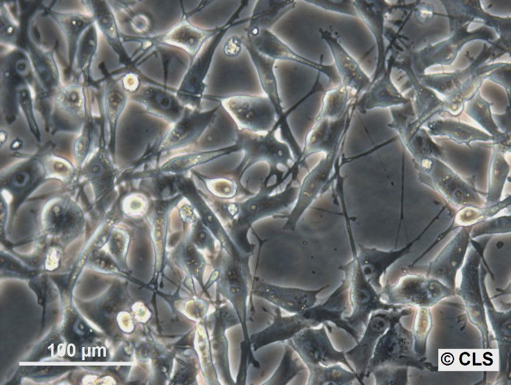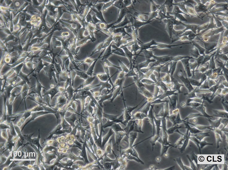 Categories: Skin cancer cell lines Description: The FO-1 cell line, also known as MEL-CLS-1, is a human amelanotic melanoma line derived from a metastatic site, specifically the iliac lymph node of a Caucasian patient. This cell line was established from a xenograft, further ensuring its utility in research focused on metastatic melanoma. Amelanotic melanoma, from which FO-1 originates, is characterized by the absence of melanin pigment, making it particularly valuable for studying melanoma subtypes that lack the typical pigmentation associated with these tumors. The FO-1 cell line exhibits a doubling time of approximately 38 hours, particularly noted at the 49th passage. This relatively fast growth rate makes it suitable for experiments requiring rapid cell proliferation. FO-1 cells are known for their differential sensitivity to various treatments, including their responsiveness to the differentiating and antiproliferative effects of interferon-beta (IFN-beta) and 12-O-tetradecanoyl-phorbol-13-acetate (TPA), making them a critical model for studying the modulation of melanoma-associated antigens and HLA antigen expression under various experimental conditions. Organism: Human Tissue: Skin Disease: Amelanotic melanoma Metastatic Site: Iliac lymph node Synonyms: FO-1, FO #1, FO 1, MEL-CLS-1 Age: 54 years Gender: Female Ethnicity: Caucasian Growth Properties: Adherent Citation: FO-1 (MEL-CLS-1) (Cytion catalog number 300175) Biosafety Level: 1 Ncbi_ Taxid: 9606.0 Cellosaurus Accession: CVCL_5619 Protein Expression: p53(+) Tumorigenic: Yes, in nude mice Viruses: Negative for: Sendai, Ectromelia, Polyoma, K-Virus, Kilham, Reo 3, PVM, LCM, M.pulmonis, MVM, Theiler's GD VII, Toolan's H-1, MHV, LDV, RCV/SDA, M-Adenovirus, B.piliformis. Mutational Profile: BRAF V600Emut Karyotype: Modal number 51, range 38-56 Culture Medium: DMEM, w: 4.5 g/L Glucose, w: 4 mM L-Glutamine, w: 3.7 g/L NaHCO3, w: 1.0 mM Sodium pyruvate (Cytion article number 820300a) Supplements: Supplement the medium with 10% FBS Dissociation Reagent: Accutase Subculturing: Remove the old medium from the adherent cells and wash them with PBS that lacks calcium and magnesium. For T25 flasks, use 3-5 ml of PBS, and for T75 flasks, use 5-10 ml. Then, cover the cells completely with Accutase, using 1-2 ml for T25 flasks and 2.5 ml for T75 flasks. Let the cells incubate at room temperature for 8-10 minutes to detach them. After incubation, gently mix the cells with 10 ml of medium to resuspend them, then centrifuge at 300xg for 3 minutes. Discard the supernatant, resuspend the cells in fresh medium, and transfer them into new flasks that already contain fresh medium. Seeding Density: 1 x 104 cells/cm2 Fluid Renewal: Every 3 days Post Thaw Recovery: After thawing, plate the cells at 5 x 104 cells/cm2 and allow the cells to recover from the freezing process and to adhere for at least 24 hours. Freeze Medium: As a cryopreservation medium, use complete growth medium (including FBS) + 10% DMSO for adequate post-thaw viability, or CM-1 (Cytion catalog number 800100), which includes optimized osmoprotectants and metabolic stabilizers to enhance recovery and reduce cryo-induced stress. Thawing And Culturing Cells: Confirm that the vial remains deeply frozen upon delivery, as cells are shipped on dry ice to maintain optimal temperatures during transit. Upon receipt, either store the cryovial immediately at temperatures below -150°C to ensure the preservation of cellular integrity, or proceed to step 3 if immediate culturing is required. For immediate culturing, swiftly thaw the vial by immersing it in a 37°C water bath with clean water and an antimicrobial agent, agitating gently for 40-60 seconds until a small ice clump remains. Perform all subsequent steps under sterile conditions in a flow hood, disinfecting the cryovial with 70% ethanol before opening. Carefully open the disinfected vial and transfer the cell suspension into a 15 ml centrifuge tube containing 8 ml of room-temperature culture medium, mixing gently. Centrifuge the mixture at 300 x g for 3 minutes to separate the cells and carefully discard the supernatant containing residual freezing medium. Gently resuspend the cell pellet in 10 ml of fresh culture medium. For adherent cells, divide the suspension between two T25 culture flasks, for suspension cultures, transfer all the medium into one T25 flask to promote effective cell interaction and growth. Adhere to established subculture protocols for continued growth and maintenance of the cell line, ensuring reliable experimental outcomes. Sterility: Mycoplasma contamination is excluded using both PCR-based assays and luminescence-based mycoplasma detection methods. To ensure there is no bacterial, fungal, or yeast contamination, cell cultures are subjected to daily visual inspections. Safety Precautions: When planning to store a cryovial in liquid nitrogen for future thawing, it is mandatory to adhere to stringent safety measures. Appropriate protective gloves and clothing are essential, and the use of a face mask or safety goggles is required during the transfer of frozen samples to or from the liquid nitrogen tank. This is to mitigate the risk of injury from potential cryovial explosions upon removal, which can result in the projection of sharp fragments. Warranty: We stand by the promise of delivering products with high cell viability and robust culture performance. To achieve the best results, please make sure you follow the storage and culture instructions detailed in the product information sheet closely. Your adherence to these guidelines is key to success. Subject To Material Transfer Agreements: If you intend to use Cytion cell lines solely for internal research at a single research site, please complete and sign our Material Transfer Agreement (MTA) and submit it along with your order.For any commercial applications - including but not limited to fee-for-service work, quality control testing, product release, diagnostic 