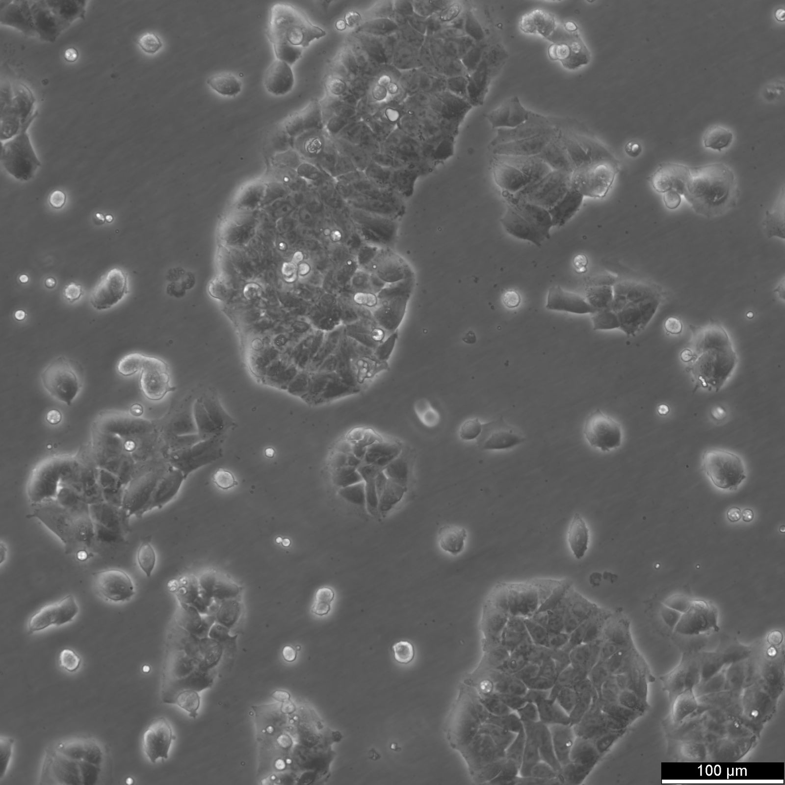Categories: Intestine cancer cell lines Description: HCT-15 cells are derived from the adenocarcinoma of the colon of a 44-year-old Caucasian male. This cell line, developed in the early 1970s, is widely utilized in the field of cancer research, especially for exploring the biology and treatment of colorectal cancer. Morphologically, HCT-15 cells are characterized by an epithelial-like appearance with a tendency to grow both as a monolayer and in clusters, displaying significant cellular heterogeneity. This feature mirrors the varied cellular environments found in solid tumors, making HCT-15 a valuable model for studying tumor dynamics and cellular interactions within the tumor microenvironment. Genotypically, HCT-15 cells exhibit a hyperdiploid karyotype with multiple chromosomal aberrations, typical of many colorectal cancers. These include mutations in key oncogenes and tumor suppressor genes, such as mutations in the KRAS gene and deletions affecting the p53 pathway, which are implicated in the pathogenesis and progression of colorectal cancer. These genetic traits make HCT-15 cells a crucial tool for investigating genetic and molecular mechanisms associated with cancer progression, metastasis, and resistance to therapies. The broad use of HCT-15 cells in research has led to significant insights into the molecular pathways involved in colorectal cancer, enhancing our understanding of disease mechanisms and aiding in the development of targeted therapies. Organism: Human Tissue: Colorectal Disease: Adenocarcinoma Synonyms: HCT 15, HCT.15, HCT15 Age: 67 years Gender: Male Morphology: Epithelial-like Growth Properties: Adherent Citation: HCT-15 (Cytion catalog number 300229) Biosafety Level: 1 Ncbi_ Taxid: 9606.0 Cellosaurus Accession: CVCL_0292 Antigen Expression: The cells are positive for keratin by immunoperoxidase staining. Tumorigenic: In nude mice Viruses: Reverse Transcriptase negative Culture Medium: RPMI 1640, w: 2.0 mM stable Glutamine, w: 2.0 g/L NaHCO3 (Cytion article number 820700a) Supplements: Supplement the medium with 10% FBS Dissociation Reagent: Accutase Doubling Time: 15 hours Subculturing: Remove the old medium from the adherent cells and wash them with PBS that lacks calcium and magnesium. For T25 flasks, use 3-5 ml of PBS, and for T75 flasks, use 5-10 ml. Then, cover the cells completely with Accutase, using 1-2 ml for T25 flasks and 2.5 ml for T75 flasks. Let the cells incubate at room temperature for 8-10 minutes to detach them. After incubation, gently mix the cells with 10 ml of medium to resuspend them, then centrifuge at 300xg for 3 minutes. Discard the supernatant, resuspend the cells in fresh medium, and transfer them into new flasks that already contain fresh medium. Seeding Density: 1 to 2 x 104 cells/cm2 Fluid Renewal: 2 to 3 times per week Post Thaw Recovery: Fast Freeze Medium: As a cryopreservation medium, use complete growth medium (including FBS) + 10% DMSO for adequate post-thaw viability, or CM-1 (Cytion catalog number 800100), which includes optimized osmoprotectants and metabolic stabilizers to enhance recovery and reduce cryo-induced stress. Thawing And Culturing Cells: Confirm that the vial remains deeply frozen upon delivery, as cells are shipped on dry ice to maintain optimal temperatures during transit. Upon receipt, either store the cryovial immediately at temperatures below -150°C to ensure the preservation of cellular integrity, or proceed to step 3 if immediate culturing is required. For immediate culturing, swiftly thaw the vial by immersing it in a 37°C water bath with clean water and an antimicrobial agent, agitating gently for 40-60 seconds until a small ice clump remains. Perform all subsequent steps under sterile conditions in a flow hood, disinfecting the cryovial with 70% ethanol before opening. Carefully open the disinfected vial and transfer the cell suspension into a 15 ml centrifuge tube containing 8 ml of room-temperature culture medium, mixing gently. Centrifuge the mixture at 300 x g for 3 minutes to separate the cells and carefully discard the supernatant containing residual freezing medium. Gently resuspend the cell pellet in 10 ml of fresh culture medium. For adherent cells, divide the suspension between two T25 culture flasks, for suspension cultures, transfer all the medium into one T25 flask to promote effective cell interaction and growth. Adhere to established subculture protocols for continued growth and maintenance of the cell line, ensuring reliable experimental outcomes. Sterility: Mycoplasma contamination is excluded using both PCR-based assays and luminescence-based mycoplasma detection methods. To ensure there is no bacterial, fungal, or yeast contamination, cell cultures are subjected to daily visual inspections. Safety Precautions: When planning to store a cryovial in liquid nitrogen for future thawing, it is mandatory to adhere to stringent safety measures. Appropriate protective gloves and clothing are essential, and the use of a face mask or safety goggles is required during the transfer of frozen samples to or from the liquid nitrogen tank. This is to mitigate the risk of injury from potential cryovial explosions upon removal, which can result in the projection of sharp fragments. Warranty: We stand by the promise of delivering products with high cell viability and robust culture performance. To achieve the best results, please make sure you follow the storage and culture instructions detailed in the product information sheet closely. Your adherence to these guidelines is key to success. Subject To Material Transfer Agreements: If you intend to use Cytion cell lines solely for internal research at a single research site, please complete and sign our Material Transfer Agreement (MTA) and submit it along with your order.For any commercial applications - including but not limited to fee-for-service work, quality control testing, product release, diagnostic use, or regulatory studies - please complete