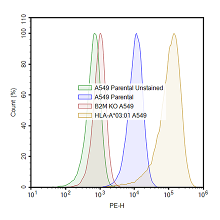The HLA-A*03:01 A549 Cell Line is a A549 human lung cancer cell line that was generated by selecting a single clone of B2M Knockout A549 cells (#82871) transduced with lentivirus expressing B2M (beta-2 microglobulin) HLA (human leukocyte antigen)-A*03:01 driven by an EF1a promoter (#82425). This cell line has been validated by flow cytometry. Purchase of this cell line is for research purposes only, commercial use requires a separate license. Human Leukocyte Antigen-A (HLA-A) is an MHC-I (major histocompatibility complex) heavy chain receptor, composed of HLA-A and beta2-microglobulin (B2M). There are over 200 genes encoding HLA variants and this variability plays a critical role in adaptive immunity. HLA-A*03 has been used as predictive biomarker in relation to the response of patients to ICI (immune checkpoint inhibitors). HLA-A*03:01 in particular has been linked to the development of stronger side effects to one of the COVID-19 vaccines. The understanding of the association between HLA alleles and diseases will allow a refinement of therapeutic strategies.