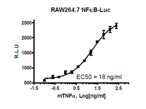 The NF-kappaB reporter (Luc)-Raw 264.7 cell line is designed for monitoring nuclear factor Kappa B (NF-kappaB) signal transduction pathways. It contains a firefly luciferase gene driven by four copies of the NF-kappaB response element located upstream of the minimal TATA promoter. After activation by pro-inflammatory cytokines or stimulants of lymphokine receptors, endogenous NF-kappaB transcription factors bind to the DNA response elements, inducing transcription of the luciferase reporter gene.