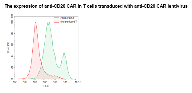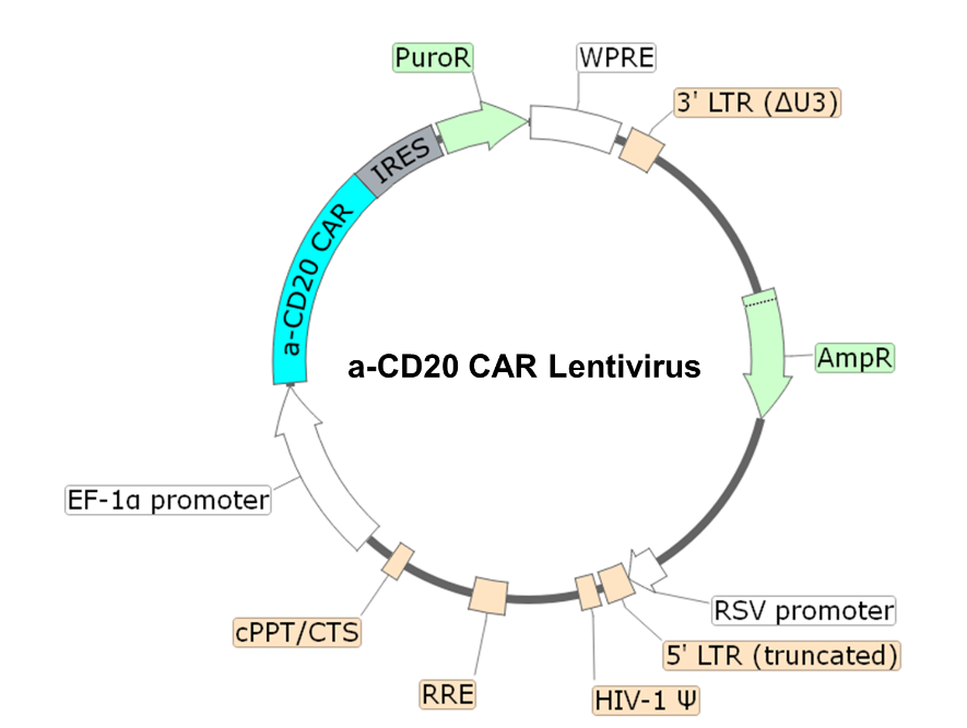 The anti-CD20 CAR lentiviruses are replication incompetent, HIV-based, VSV-G-pseudotyped lentiviral particles that are ready to infect almost all types of mammalian cells, including primary and non-dividing cells. These viruses transduce the ScFv (single-chain variable fragment) of anti-CD20 (clone Leu-16) linked to a 2nd generation CAR (Chimeric Antigen Receptor) containing CD8 hinge and transmembrane domains, and the 4-1BB and CD3zeta signaling domains.