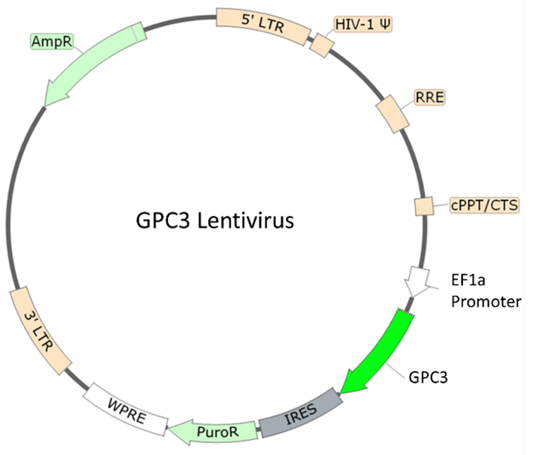 The GPC3 Lentiviruses are replication incompetent, HIV-based, VSV-G pseudotyped lentiviral particles that are ready to transduce nearly all types of mammalian cells, including primary and non-dividing cells. The particles contain a human GPC3 (Glypican 3, NM_ 004484.2) driven by an EF1A promoter and a puromycin selection marker (Figure 1). Figure 1: Schematic of the lenti-vector used to generate the GPC3 Lentivirus.
