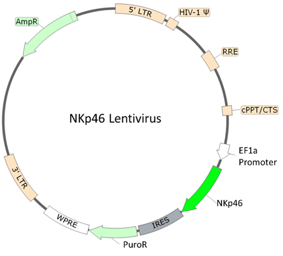 The NKp46 Lentiviruses are replication incompetent, HIV-based, VSV-G pseudotyped lentiviral particles that are ready to transduce nearly all types of mammalian cells, including primary and non-dividing cells. The particles contain a human NKp46 (NM_004829.7) driven by an EF1A promoter and a puromycin selection marker (Figure 1). Figure 1: Schematic of the lenti-vector used to generate the NKp46 Lentivirus.