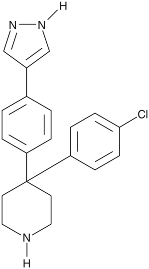 AT7867 is a potent and orally bioavailable inhibitor of Akt isoforms Akt1, 2, and 3 (IC50s = 32, 17, and 47 nM, respectively). It also inhibits p70S6 kinase and PKA (IC50s = 85 and 20 nM, respectively), but is without effect against a panel of other kinases. AT7867 inhibits growth and induces apoptosis in a variety of cancer cell lines in vitro and suppresses tumor growth of PTEN-deficient xenografts in mice.Formal Name: 4-(4-chlorophenyl)-4-[4-(1H-pyrazol-4-yl)phenyl]-piperidine. CAS Number: 857531-00-1. Molecular Formula: C20H20ClN3. Formula Weight: 337.9. Purity: >98%. Formulation: (Request formulation change), A crystalline solid. Solubility: DMSO: 0.33 mg/ml. lambdamax: 258 nm. SMILES: ClC1=CC=C(C=C1)C2(CCNCC2)C3=CC=C(C4=CNN=C4)C=C3. InChi Code: InChI=1S/C20H20ClN3/c21-19-7-5-18(6-8-19)20(9-11-22-12-10-20)17-3-1-15(2-4-17)16-13-23-24-14-16/h1-8,13-14,22H,9-12H2,(H,23,24). InChi Key: LZMOSYUFVYJEPY-UHFFFAOYSA-N.
