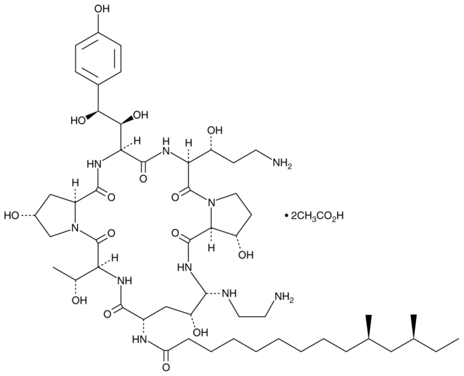 Caspofungin is an echinocandin antifungal originally isolated from G. lozoyensis and a derivative of pneumocandin B0 (Cay-21527). It is active against 3,959 Candida clinical isolates (MIC90 = 1 µg/ml), including isolates resistant to fluconazole (Cay-11594) or itraconazole (Cay-13288), as well as 38 Aspergillus clinical isolates, including A. flavus, A. niger, A. terreus, and A. fumigatus (MICs = 50 = 0.6 nM in C. albicans membrane preparations). It increases survival in mouse models of disseminated candidiasis or aspergillosis.Formal Name: 1-[(4R,5S)-5-[(2-aminoethyl)amino]-N2-[(10R,12S)-10,12-dimethyl-1-oxotetradecyl]-4-hydroxy-L-ornithine]-5-[(3R)-3-hydroxy-lornithine]-pneumocandin B0 acetate (1:2). CAS Number: 179463-17-3. Synonyms: L-743,872, MK 0991. Molecular Formula: C52H88N10O15 . 2C2H4O2. Formula Weight: 1213.4. Purity: >98%. Formulation: (Request formulation change), A crystalline solid. Solubility: DMF: 20 mg/ml, DMSO: 25 mg/ml, Ethanol: 20 mg/ml, PBS (pH 7.2): 3 mg/ml. SMILES: O=C([C@](NC1=O)([H])[C@@H]([C@@H](O)C2=CC=C(C=C2)O)O)N[C@]([H])(C(N3[C@@]([H])([C@H](CC3)O)C(N[C@@H]([C@@H](C[C@@H](C(N[C@@](C(N4[C@]1(C[C@H](C4)O)[H])=O)([H])[C@@H](C)O)=O)NC(CCCCCCCC[C@H](C[C@H](CC)C)C)=O)O)NCCN)=O)=O)[C@@H](CCN)O.CC(O)=O.CC(O)=O. InChi Code: InChI=1S/C52H88N10O15.2C2H4O2/c1-5-28(2)24-29(3)12-10-8-6-7-9-11-13-39(69)56-34-26-38(68)46(55-22-21-54)60-50(75)43-37(67)19-23-61(43)52(77)41(36(66)18-20-53)58-49(74)42(45(71)44(70)31-14-16-32(64)17-15-31)59-48(73)35-25-33(65)27-62(35)51(76)40(30(4). InChi Key: OGUJBRYAAJYXQP-IJFZAWIJSA-N.