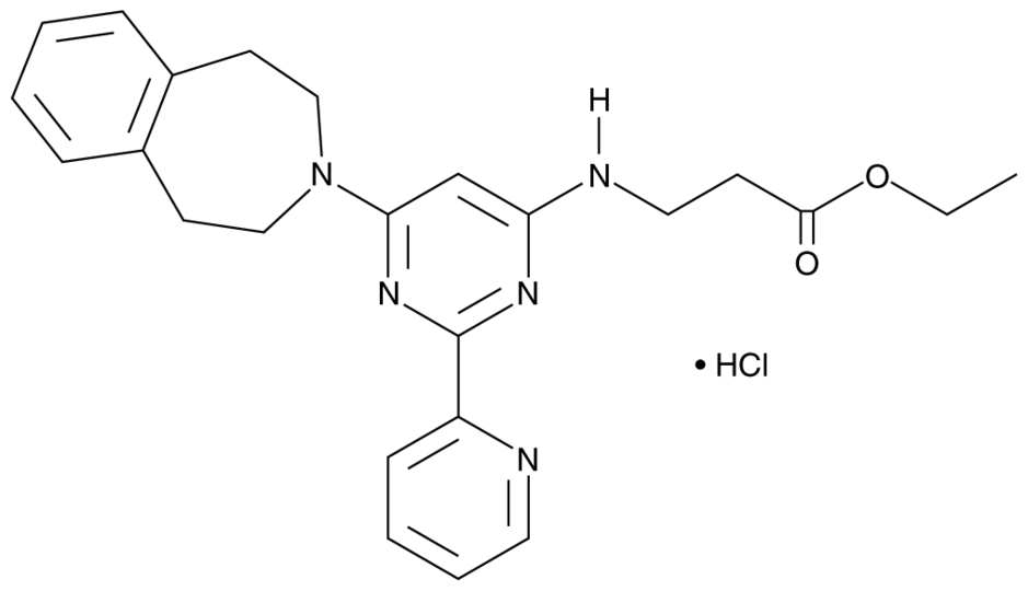 The histone H3 lysine 27 (H3K27) demethylase JMJD3 plays important roles in the transcriptional regulation of cell differentiation, development, the inflammatory response, and cancer. GSK-J4 (hydrochloride) is an ethyl ester derivative of the JMJD3 selective histone demethylase inhibitor GSK-J1 (Cay-12054) with an IC50 value greater than 50 µM in vitro. Acting as a prodrug, GSK-J4 is rapidly hydrolyzed in cells to the otherwise cell impermeable GSK-J1, which exhibits an IC50 value of 60 nM for the purified enzyme. When administered to human primary macrophages, GSK-J4 can reduce LPS-induced proinflammatory cytokine production, most notably including that of TNFalpha (IC50 = 9 µM).Formal Name: N-[2-(2-pyridinyl)-6-(1,2,4,5-tetrahydro-3H-3-benzazepin-3-yl)-4-pyrimidinyl]-beta-alanine, ethyl ester, monohydrochloride. CAS Number: 1797983-09-5. Molecular Formula: C24H27N5O2 . HCl. Formula Weight: 454.0. Purity: >98%. Formulation: (Request formulation change), A crystalline solid. Solubility: DMF: 30 mg/ml, DMSO: 30 mg/ml, DMSO:PBS (pH 7.2) (1:7): 0.1 mg/ml, Ethanol: 20 mg/ml. lambdamax: 260 nm. SMILES: O=C(OCC)CCNC1=CC(N2CCC(C=CC=C3)=C3CC2)=NC(C4=CC=CC=N4)=N1.Cl. InChi Code: InChI=1S/C24H27N5O2.ClH/c1-2-31-23(30)10-14-26-21-17-22(28-24(27-21)20-9-5-6-13-25-20)29-15-11-18-7-3-4-8-19(18)12-16-29,/h3-9,13,17H,2,10-12,14-16H2,1H3,(H,26,27,28),1H. InChi Key: TYXWLTBYINKVNT-UHFFFAOYSA-N.