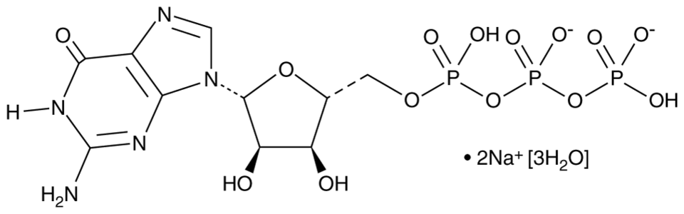 Guanosine 5'-triphosphate (GTP) acts as a substrate for the synthesis of RNA during the transcription process and the synthesis of DNA during DNA replication. It is generated by the citric acid cycle and provides a source of energy for protein synthesis and gluconeogenesis, activating substrates in metabolic reactions. GTP is essential for G protein-related signal transduction in second-messenger mechanisms where it is converted to GDP through the action of GTPases.Formal Name: guanosine 5'-(tetrahydrogen triphosphate), disodium salt, trihydrate. CAS Number: 56001-37-7. Synonyms: GTP. Molecular Formula: C10H14N5O14P3 . 2Na [3H2O]. Formula Weight: 621.2. Purity: >90%. Formulation: (Request formulation change), A crystalline solid. Solubility: PBS (pH 7.2): 10 mg/ml. SMILES: O[C@H]1[C@@H](O)[C@H](N2C=NC3=C2N=C(N)NC3=O)O[C@@H]1COP(OP(OP(O)([O-])=O)([O-])=O)(O)=O.[Na+].[Na+].O.O.O. InChi Code: InChI=1S/C10H16N5O14P3.2Na.3H2O/c11-10-13-7-4(8(18)14-10)12-2-15(7)9-6(17)5(16)3(27-9)1-26-31(22,23)29-32(24,25)28-30(19,20)21,,,,,/h2-3,5-6,9,16-17H,1H2,(H,22,23)(H,24,25)(H2,19,20,21)(H3,11,13,14,18),,,3*1H2/q,2*+1,,,/p-2/t3-,5-,6-,9-,,,,,/m1...../. InChi Key: ZLLZROALIYHJNQ-LTPGDGGNSA-L.