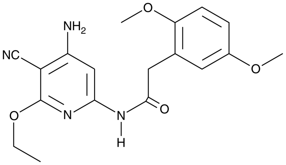 JNK inhibitor VIII is an inhibitor of JNK1, JNK2, and JNK3 (Kis= 2, 4, and 52 nM, respectively). It is selective for JNK1, JNK2, and JNK3 over a panel of 74 kinases (Kis = >720 nM for all). It inhibits the phosphorylation of c-Jun in HepG2 cells (EC50 = 920 nM). JNK inhibitor VIII (10 µM) inhibits NGF-induced neuronal growth and proNGF-induced neurotoxicity of primary mouse superior cervical ganglion neurons. It reduces apoptosis induced by glutathione peroxidase 1 (GPX1) siRNA knockdown in HeLa cells when used at a concentration of 10 µM.Formal Name: N-(4-amino-5-cyano-6-ethoxy-2-pyridinyl)-2,5-dimethoxy-benzeneacetamide. CAS Number: 894804-07-0. Synonyms: c-Jun N-terminal Kinase Inhibitor VIII, TCS JNK 6o. Molecular Formula: C18H20N4O4. Formula Weight: 356.4. Purity: >98%. Formulation: (Request formulation change), A crystalline solid. Solubility: DMF: 10 mg/ml, DMSO: 10 mg/ml, DMSO:PBS(pH 7.2) (1:2): 0.3 mg/ml. lambdamax: 230, 274 nm. SMILES: COC1=CC(CC(NC2=CC(N)=C(C#N)C(OCC)=N2)=O)=C(OC)C=C1. InChi Code: InChI=1S/C18H20N4O4/c1-4-26-18-13(10-19)14(20)9-16(22-18)21-17(23)8-11-7-12(24-2)5-6-15(11)25-3/h5-7,9H,4,8H2,1-3H3,(H3,20,21,22,23). InChi Key: KQMPRSZTUSSXND-UHFFFAOYSA-N.