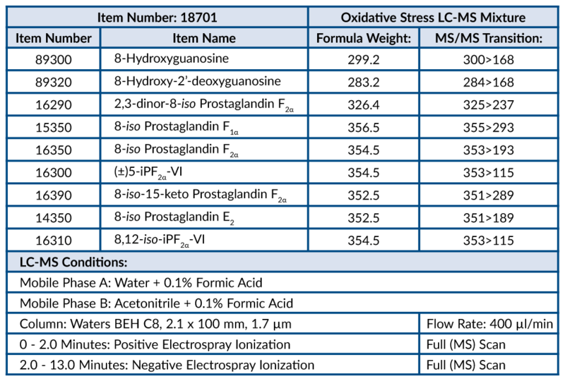 The Oxidative Stress MaxSpec(R) LC-MS Mixture is a mixture of lipids and nucleic acids produced during oxidative stress in biological systems. The mixture is supplied in an amber ampule in which the headspace has been purged with argon to prevent lipid oxidation. This product has been designed for direct use in LC-MS applications. The solution may be serially diluted for preparation of calibrators and QC standards and/or used directly as a system suitability standard or tuning standard. After opening, we recommend that the mixture be transferred immediately to a 1 ml glass screw cap vial, to prevent solvent evaporation, and stored at -20°C. The mixture should be discarded after multiple freeze/thaw cycles.The compounds in this mixture represent the major lipids and nucleic acids that can be detected in serum or urine following oxidative stress. They include the major accepted biomarkers for oxidative stress.Formulation: (Request formulation change), A solution in ethanol (1 µg/ml of each compound).