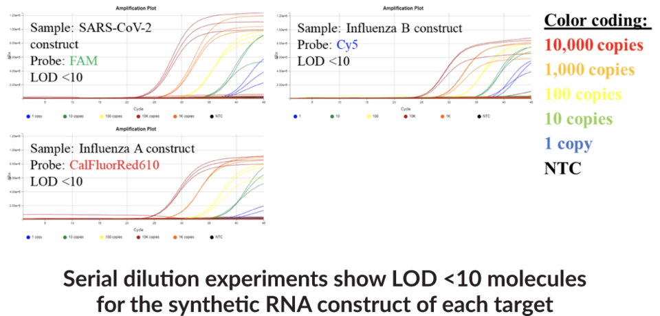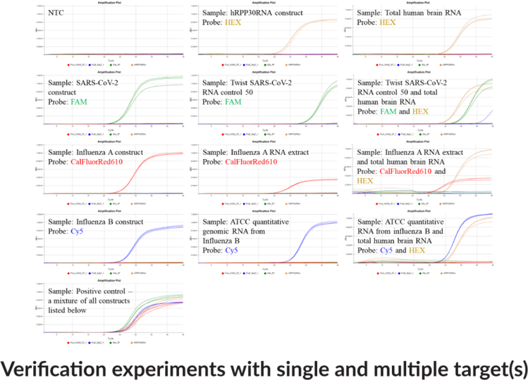 Oliogonucleotide recipes are optimized for Bio-Rad CFX96 or CFX384. Includes 4 tubes: Tube 1: 5X Primers and probes for 4 pathogens and human control Tube 2: Synthetic positive controls Tube 3: Spike-in RPP30 control Tube 4: 2X RT-qPCR enzyme mastermix Organism Type: Virus (-)ssRNA, Virus (+)ssRNA, Multiplexed Reaction Panels: COVID, Viral-URP Colors: Cys5 (Influenza B), FAM (Influenza A), HEX (RPP30), TexasRED615 (SARS-CoV2)Synonyms: Viral Upper Respiratory Panel, Virus Upper Respiratory Panel.