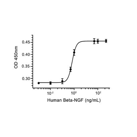 Recombinant human Beta Nerve Growth Factor (B-NGF), partial length, encompassing amino acids 122-239. This construct is tag-free and was affinity purified. NGF is mainly responsible for the survival and the differentiation and the functional activities of sensory and sympathetic neurons in the peripheral nervous system. It also plays an important role in the development and functional activities of cholinergic neurons in the central nervous system. Since NGF is synthesized also in non-neuronal tissues it may have a much wider spectrum of biological activities than thought previously. NGF stimulates chemotactic migration of human polymorphonuclear leukocytes in vitro. NGF stimulates the growth and differentiation of B-cells and the growth of T-cells and of some tumor cell types. NGF inhibits immunoglobulin production by various human plasma cell. The cytokines IL-1, IL-6, and bFGF are potent inducers of NGF. NGF induces the synthesis of IL-1 in pheochromocytoma cells which in turn acts as a growth factor for glial cells and induces the synthesis of NGF following nerve injuries. In thymic stromal cells NGF induces the synthesis of IL-6. NGF induces the synthesis of the fos oncogene and the myc oncogene and also influences the expression of EGF. One receptor that is responsible for mediating most of the activities of NGF is expressed preferentially in neuronal tissues. This glycoprotein of 140 kDa is the product of the trk gene. It possesses an intrinsic tyrosine-specific protein kinase in its intracellular domain.