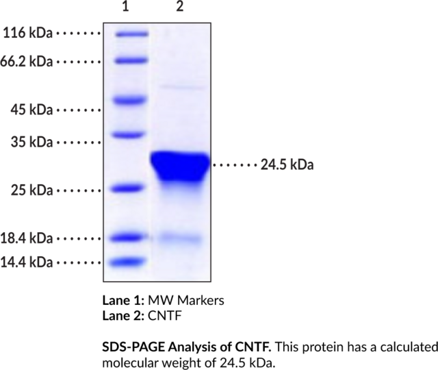 Ciliary neurotrophic factor (CNTF) is a member of the IL-6 superfamily of cytokines. It is a class-I helical cytokine that contains binding sites for a complex of CNTF receptor alpha (CNTFRalpha), glycoprotein 130 (gp130), and leukemia inhibitor factor receptor beta (LIFRbeta). CNTF is expressed in the brain, eyes, bone, and liver, as well as in spinal cord glial cells, astrocytes, Schwann cells, and skeletal muscle. It is involved in neuroprotection, neuroinflammation, neurogenesis, metabolism, and bone remodeling and primarily signals through the JAK/STAT pathway. Recombinant CNTF induces neurite outgrowth in chick embryonic dorsal root ganglion neurons and increases neuron survival in chick embryonic ciliary ganglia in vitro. Homozygous knockout of Cntf decreases facial motor neuron number and forelimb grip strength in mice. CNTF also decreases body weight, food intake, and serum insulin levels in ob/ob mice. Serum levels of CNTF are increased in patients with amyotrophic lateral sclerosis (ALS). Cayman's CNTF (human, recombinant) protein can be used for cell-based assays. This protein consists of 214 amino acids and has a calculated molecular weight of 24. kDa.. Protein function: CNTF is a survival factor for various neuronal cell types. Seems to prevent the degeneration of motor axons after axotomy. [The UniProt Consortium]