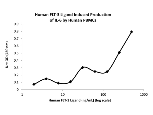 Flt-3 Ligand purity was determined to be greater than 98% as determined by analysis by HpLC, UV-Spectroscopy at 280nm and by reducing and non-reducing SDS-pAGE. Protein function: Stimulates the proliferation of early hematopoietic cells by activating FLT3. Synergizes well with a number of other colony stimulating factors and interleukins. [The UniProt Consortium]