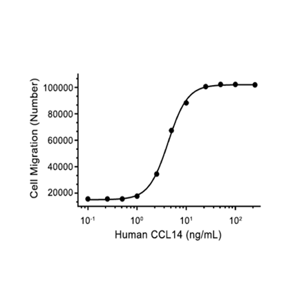 Recombinant human HCC-1, also known as CCL14, encompassing amino acids 22-93, corresponding to full length of mature isoform-1. This construct is tag-free. This protein was affinity purified. Hemofiltrate C-C chemokine (HCC)-1 is a recently described monocyte chemoattractant. CCL14 (also known as HCC-1) belongs to the CC chemokine family. Its mature propeptide is a low- affinity agonist of CCR1 that is converted to a high- affinity agonist of CCR1 and CCR5 on proteolytic processing by serine proteases. Determination of the amino acid sequence of HCC-1 revealed four cysteine residues in positions characteristic of the C-C chemokine family, and comparison with the sequences of other chemokines revealed that HCC-1 was most homologous to MIP-1a. However, several functional properties of HCC-1 were atypical of chemokines. Unlike other chemokines, HCC-1 was expressed constitutively in a number of tissues and was present at high concentrations in normal human plasma. In addition, HCC-1 was reported not to be chemotactic for leukocytes.