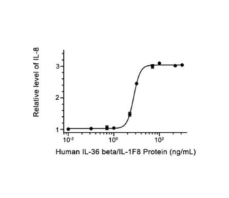 Recombinant human IL-26 beta, also known as IL-1F8, encompassing amino acids 5-157, corresponding to the full lenght mature isoform 2. This construct does not have a tag. The protein was affinity purified. Interleukin-36 (IL-36) is not a single cytokine but a group of proinflammatory cytokines that belong to the IL-1 family and are expressed in epithelial barriers such as the skin, gut, and lungs. The IL-36 group consists of three ligand isoforms: IL-36alpha, IL-36beta and IL-36gamma, which are activated when the pro-protein forms are cleaved by neutrophil derived proteases. Signaling is initiated when IL-36 binds to the Interleukin 36 receptor (IL-36R), also known as IL-1RL2, and its co receptor IL-1 receptor accessory protein (IL-1RAP). This triggers a pro-inflammatory response predominantly through the NF-kappaB (nuclear factor kappa-light-chain-enhancer of activated B cells) and MAPK (mitogen-activated protein kinase) signaling pathways. Dysregulated IL-36 signaling has been implicated in a variety of inflammatory diseases, most notably psoriasis where IL-36 is abundantly expressed in keratinocytes (KCs) on the skin. The field of IL-36-targeted therapies is rapidly evolving, spearheaded by the development of IL-36R antagonists. Spesolimab, FDA-approved for the treatment of generalized pustular psoriasis (GPP), is a humanized monoclonal antibody that blocks IL-36R, effectively inhibiting the activation of downstream inflammatory pathways. Additional IL-36R blocking therapies have shown promising results, with Imsidolimab currently undergoing Phase III trials for the treatment of GPP.