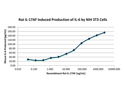 Interleukin-17AF Heterodimer purity was determined to be greater than 98% as determined by HpLC, analysis by UV-Spectroscopy at 280nm, and by reducing and non-reducing SDS-pAGE. Protein function: Induces stromal cells to produce proinflammatory and hematopoietic cytokines. [The UniProt Consortium]