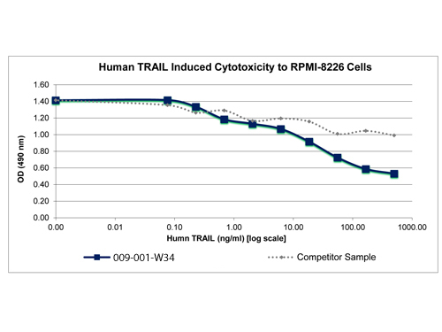 TRAIL purity was determined to be greater than 90% as determined by analysis by UV-Spectroscopy at 280nm and by reducing and non-reducing SDS-pAGE. Protein function: Cytokine that binds to TNFRSF10A/TRAILR1, TNFRSF10B/TRAILR2, TNFRSF10C/TRAILR3, TNFRSF10D/TRAILR4 and possibly also to TNFRSF11B/OPG. Induces apoptosis. Its activity may be modulated by binding to the decoy receptors TNFRSF10C/TRAILR3, TNFRSF10D/TRAILR4 and TNFRSF11B/OPG that cannot induce apoptosis. [The UniProt Consortium]
