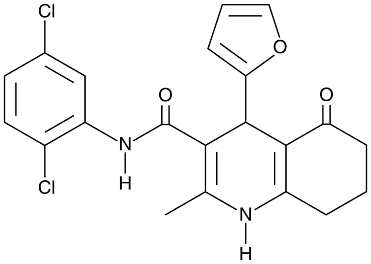 Free fatty acid receptor 3 (FFAR3, GPR41) is a G protein-coupled receptor activated by short chain fatty acids (SCFAs). It is expressed in adipose tissue, the gastrointestinal tract, and the peripheral nervous system, and it is involved in SCFA-dependent energy regulation. AR-420626 is a selective agonist of FFAR3 (GPR41, IC50 = 117 nM) that does not activate the related receptor FFAR2 (GPR43) at concentrations up to 100 µM. At 10 µM, it can stimulate a 1.26-fold increased release of glucagon-like peptide-1 from colonic crypt cultures.Formal Name: N-(2,5-dichlorophenyl)-4-(2-furanyl)-1,4,5,6,7,8-hexahydro-2-methyl-5-oxo-3-quinolinecarboxamide. CAS Number: 1798310-55-0. Molecular Formula: C21H18Cl2N2O3. Formula Weight: 417.3. Purity: >95%. Formulation: (Request formulation change), A crystalline solid. Solubility: DMF: 2 mg/ml, DMSO: 5 mg/ml, DMSO:PBS(pH 7.2) (1:4): 0.2 mg/ml. lambdamax: 212, 262, 358 nm. SMILES: ClC1=CC(NC(C2=C(C)NC(CCCC3=O)=C3C2C4=CC=CO4)=O)=C(Cl)C=C1. InChi Code: InChI=1S/C21H18Cl2N2O3/c1-11-18(21(27)25-15-10-12(22)7-8-13(15)23)20(17-6-3-9-28-17)19-14(24-11)4-2-5-16(19)26/h3,6-10,20,24H,2,4-5H2,1H3,(H,25,27). InChi Key: GGTYQECCGLBHGS-UHFFFAOYSA-N.