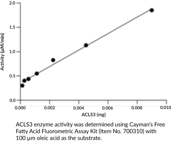 Long-chain acyl-CoA synthetase 3 (ACSL3) is an enzyme involved in lipid biosynthesis and fatty acid degradation. It is composed of short N- and C-terminal domains surrounding an AMP-binding domain. It is expressed in the brain and prostate and localizes to the endoplasmic reticulum, mitochondria, and lipid droplets. ACSL3 is activated by a variety of factors, including peroxisome proliferator-activated receptor delta (PPARdelta), octamer-binding transcription factor 1 (Oct1), and the liver X receptor (LXR), among others. ACSL3 converts free monounsaturated long-chain fatty acids into fatty acyl-CoA esters, which are used as substrates for phospholipid and glycerolipid biosynthesis or transported into the mitochondria to be degraded via fatty acid beta-oxidation for use as an energy source. ACSL3-dependent conversion of exogenous MUFAs into fatty acyl-CoA esters can induce resistance to ferroptotic cell death by displacing PUFAs and preventing the accumulation of lipid reactive oxygen species (ROS) in the plasma membrane. ACSL3 is required for tumor cell survival in non-small cell lung cancer (NSCLC) mouse xenograft models, including those expressing K-Ras containing the glycine-to-aspartate activating mutation at position 12 (K-RasG12D). It is also highly expressed in tumor tissues isolated from patients with early-stage NSCLC. In contrast, homozygous deletion of ACSL3 is associated with an increased risk of metastasis or recurrence in patients with triple-negative breast cancer (TNBC) receiving adjuvant chemotherapy. Cayman's ACSL3 (human, recombinant) protein can be used for ELISA, enzyme activity assay, and Western blot applications.Synonyms: ACS3, Fatty Acid CoA Ligase 3, LACS 3, Long-chain Acyl-CoA Synthetase 3, Long-chain Fatty Acid-CoA Ligase 3. Purity: >90% estimated by SDS-PAGE. Source: Active recombinant human N-Terminal His-tagged ACSL3 expressed in E. coli. Amino Acids: 45-720. MW: 77.19 kDa. Formulation: (Request formulation change), 50 mM Tris pH 8.0, with 150 mM sodium chloride and 10% glycerol. UniProt Accession #: P33121.