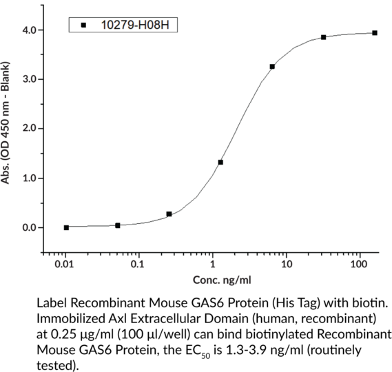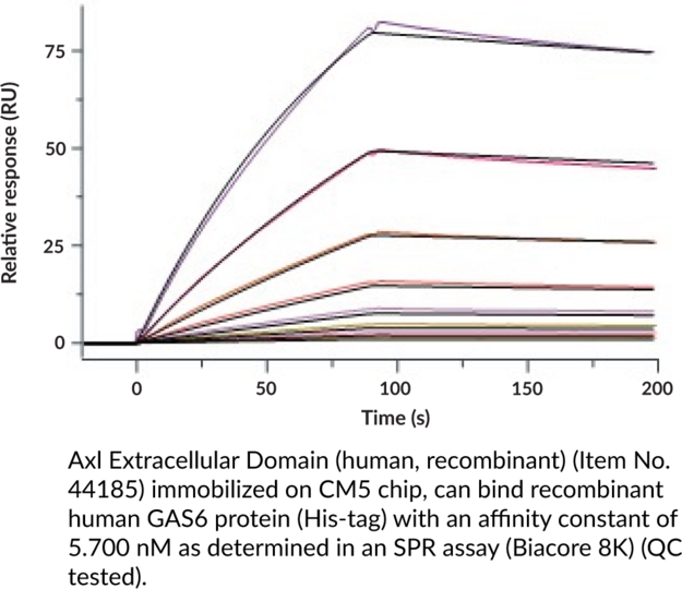 Axl is a receptor tyrosine kinase and member of the TAM kinase family. It is composed of two immunoglobulin-like (Ig-like) domains, two fibronectin-like III domains, an extracellular cleavage site, a transmembrane region, and a C-terminal kinase domain. It is ubiquitously expressed and localizes to the cell membrane. After homodimerization, Axl is activated by growth arrest-specific protein 6 (GAS6) and is involved in promoting proliferation and hematopoietic lineage differentiation and negatively regulating antigen-presenting cell activation. The extracellular domain of Axl can be cleaved by metalloproteinases, releasing soluble Axl to bind and activate membrane-associated Axl. In cancer, Axl promotes metastasis, epithelial-to-mesenchymal transition (EMT), and survival. Increased expression of AXL is associated with shorter progression-free survival in patients with non-small cell lung cancer (NSCLC). Cayman's Axl Extracellular Domain (human, recombinant) protein can be used for binding assays. This protein consists of 428 amino acids, has a calculated molecular weight of 46. kDa, and a predicted N-terminus of Glu33 after signal peptide cleavage. By SDS-PAGE, under reducing conditions, the apparent molecular mass of the protein is 60-70 kDa due to glycosylation.