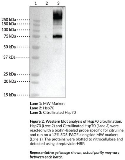 Heat shock protein 70s (Hsp70s) are abundant and stress-inducible 70 kDa molecular chaperone proteins encoded by a highly conserved, multigene family. They are monomeric proteins that can be divided into two functional domains: an N-terminal ATPase domain and a substrate binding domain that contains a highly conserved EEVD motif at its C-terminus. Hsp70s are found in the cytosol, nuclei, endoplasmic reticulum, mitochondria, and chloroplasts of eukaryotes, as well as in bacteria. They function as molecular chaperones that assist in a wide range of cellular processes, including refolding of aggregated or misfolded proteins, co- and post-translational folding and assembly of nascent peptides, membrane translocation of secretory and organellar proteins, controlling activity of regulatory nuclear receptors, kinases and transcription factors, as well as cooperativity with the Hsp90 chaperone system in eukaryotes. The Hsp70 chaperone cycle is ATP-dependent and initiated by transient interaction of the Hsp70 substrate binding domain with hydrophobic regions within a peptide or protein. It consists of an alteration between the low-affinity ATP-bound state with fast rates of substrate exchange and the high-affinity ADP bound state with slow rates of substrate exchange. Hsp70s are subject to a variety of post-translational modifications and their expression is upregulated under conditions of cellular stress and in a variety of disease states. Specifically, Hsp70 is subject to citrullination by peptidyl arginine deiminases (PADs) and citrullinated Hsp70 peptides have been found in the synovial fluid of patients with rheumatoid arthritis.Synonyms: Heat Shock Protein 70, HspA1A. Source: N-Terminal histidine-tagged human Hsp70 purified from E. coli, citrullinated by PAD2. Amino Acids: 2-641. MW: 71.7 kDa. Storage Buffer: PBS, pH 7.4, with 10% glycerol. UniProt Accession #: P0DMV8.