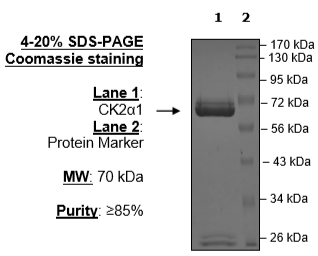 Active recombinant full-length human CK2alpha1 was expressed by baculovirus in Sf9 insect cells using a N-terminal GST tag. The gene accession number is NM_001895.