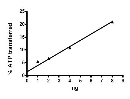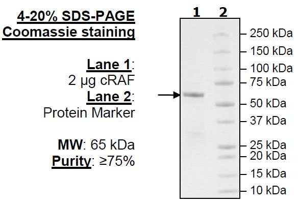 Human RAF1, also known as c-RAF (GenBank Accession No. NM_002880), a.a. 306-648, containing the mutations Y340D and Y341D, with N-terminal GST-tag, MW=65 kDa, expressed in an Baculovirus infected Sf9 cell expression system.