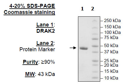 Human DRAK2, also known as DAP kinase-related apoptosis-inducing protein kinase 2 or death-associated protein kinase-related 2 (GenBank Accession No. NM_004226.3), a.a. 2-372 (end), MW = 43 kDa, expressed in a baculovirus-infected Sf9 cell expression system.