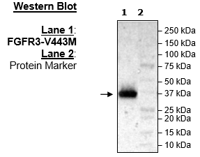 Human FGFR3, GenBank Accession # NM_000142, with V443M mutation, with N-terminal His-tag, a.a 447-761, MW= 37 kDa, expressed in Sf9 cells via a baculovirus expression system. Phosphorylation is <10%.