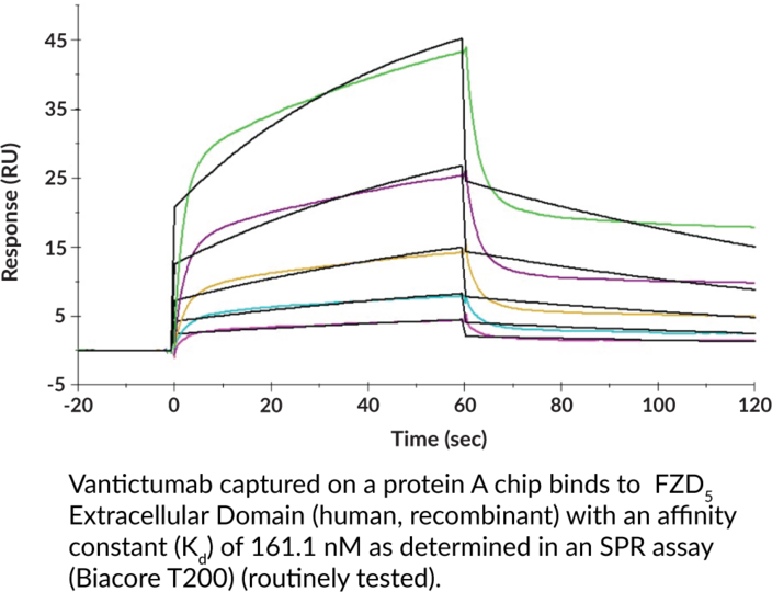 Frizzled family G protein-coupled receptor 5 (FZD5) is a Wnt receptor involved in canonical and non-canonical Wnt/beta-catenin signaling. It is composed of an extracellular cysteine-rich ligand-binding domain, seven transmembrane domains, and an intracellular C-terminal domain that binds the PDZ domain of dishevelled (Dvl) and G proteins. Fzd5 is expressed in the yolk sac, eye, and lung during development and primarily in the eye, kidney, lung, and testis in adults. Upon ligand-binding, FZD5 associates with LDL receptor-related protein 5/6 (LRP5/6) and recruits Dvl, which leads to phosphorylation of LRP5/6, recruitment of Axin, and subsequent accumulation of beta-catenin. It is involved in ocular development, mesenchymal stem cell senescence, and intestinal crypt homeostasis, and plays pro- and anti-tumorigenic roles in a context-dependent manner. A frameshift mutation in FZD5 that results in production of a secreted FZD5 extracellular domain is associated with autosomal dominant coloboma. Cayman's FZD5 Extracellular Domain (human, recombinant) protein can be used for binding assays. This protein consists of 152 amino acids, has a calculated molecular weight of 17. kDa, and a predicted N-terminus of Ala27 after signal peptide cleavage. By SDS-PAGE, under reducing conditions, the apparent molecular mass of the protein is 25-30 kDa due to glycosylation.