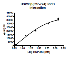 Human Heat Shock Protein 90 beta (HSP90b), GenBank Accession No. NM_001271969, a.a. 527-724 (end) with N-terminal His-tag and N-terminal Avi-tag(TM), MW = 25 kDa, expressed in an E. coli expression system and enzymatically biotin-labeled using Avi-tag(TM) technology. Assay Conditions: HSP90b (C-terminal):PPID binding activity measured using HSP90b (C-Terminal) Inhibitor Screening Assay Kit, BPS Bioscience, Catalog # 50314.