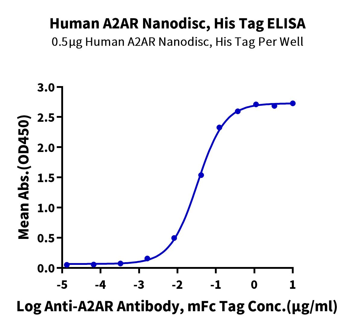 Recombinant Human A2AR Protein-Nanodisc is expressed from HEK293 with His tag at the C-terminus.It contains Met1-Ser412. Adenosine is a neuromodulator in the adult central nervous system. Membrane-bound receptors for adenosine have been identified and cDNAs for A1, A2a, A2b, and A3 adenosine receptor subtypes have been cloned recently.Expression of A2a adenosine receptor mRNA in cranial ganglia, carotid body, and intermediate lobe of the pituitary gland similarly suggests novel sites of adenosine action during development and in the adult.