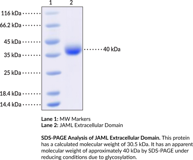 Junctional adhesion molecule-like (JAML) is a junctional adhesion molecule and member of the immunoglobulin superfamily with roles in maintenance of tight junctions and immune regulation. It is composed of an N-terminal extracellular domain, which contains two immunoglobulin-like domains, a transmembrane domain, and a C-terminal cytoplasmic tail. JAML is expressed by neutrophils, monocytes, activated CD8+ T cells, alphabeta T cells, tissue-resident gammadelta T cells, and renal podocytes and localizes to the plasma membrane at cell-cell contact regions but is absent at free cell boundaries. It regulates leukocyte adhesion and transendothelial migration, functions as a co-regulatory receptor for T cell activation, and regulates lipid metabolism in podocytes. Podocyte-specific Jaml knockout reduces podocyte injury and proteinuria in db/db diabetic mice and in a mouse model of doxorubicin-induced nephropathy. Increased JAML expression is associated with improved median and overall survival in patients with subcutaneous melanoma. Cayman's JAML Extracellular Domain (human, recombinant) protein consists of 267 amino acids, has a calculated molecular weight of 30. kDa and a predicted N-terminus of Leu20 after signal peptide cleavage. By SDS-PAGE, under reducing conditions, the apparent molecular mass of the protein is 40 kDa due to glycosylation.