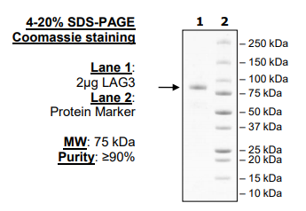 Human secreted LAG3, Fc fusion protein, also known as Lymphocyte-Activation Gene 3 and CD223, with C-terminal Avi-Tag(TM). GenBank Accession No. NM_002286, a.a. 23-450 expressed in a HEK293 cell expression system and enzymatically biotin-labeled using Avi-tag(TM) technology. MW = 74.8 kDa (monomer). This protein runs at a higher MW by SDS-PAGE due to glycosylation.