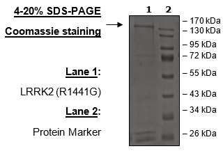 Human LRRK2 protein with a R1441G mutation, also known as PARK8, RIPK7, and ROCO2, GenBank Accession No. NM_198578, amino acids 968-end, with an N-terminal GST-tag, expressed in an SF9cell expression system. MW = 210 kDa.