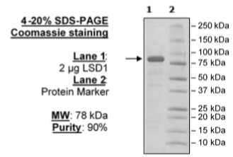 Human LSD1 [also known as KDM1A (lysine (K)-specific demethylase 1A) or AOF2, amine oxidase (flavin containing) domain 2)] GenBank Accession No. NM_015013, a.a. 158-end, MW=77.9 kDa, expressed in E. coli expression system with N-terminal GST tag and PreScission Protease site. GST-tag was cleaved after affinity purification.