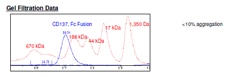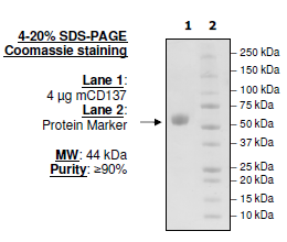 Mouse secreted CD137, also known as Tumor Necrosis Factor Receptor Superfamily member 9, TNFRSF9, and ILA, GenBank Accession No. NM_011612, a.a. 24-187 fused at the C-terminus to the Fc portion of human IgG1, expressed in a HEK293 cell expression system. MW = 44 kDa (monomer). This protein runs at a higher MW by SDS-PAGE due to glycosylation.