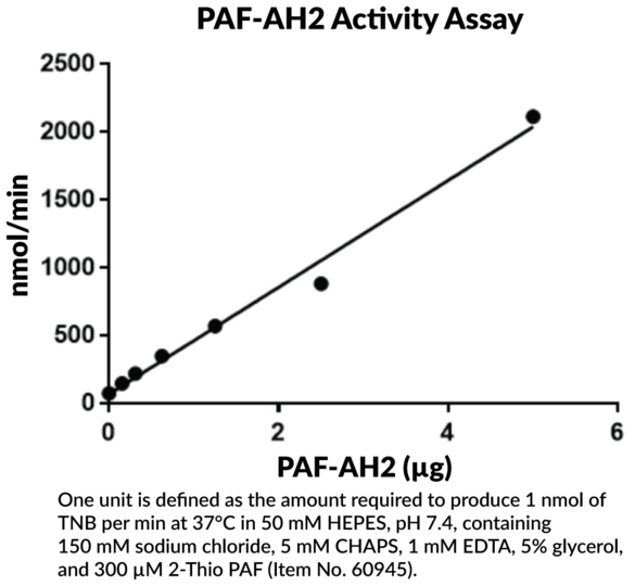 PAF acetylhydrolase 2 (PAF-AH2) is a serine-dependent, intracellular-type platelet-activating factor (PAF) acetylhydrolase that is expressed in a variety of tissue and cell types but is most abundant in the liver, kidney, testis, and intestines. It contains an N-terminal myristoylation site and can translocate from the cytosol to cellular membranes in response to various stressors including UVB radiation, LPS, or oxidative stress, during which PAF-AH2 localizes to the endoplasmic reticulum and Golgi apparatus. PAF-AH2 hydrolyzes and inactivates PAF, a phospholipid mediator involved in a variety of biological activities, including inflammation, smooth muscle contraction, and fetal development. It also hydrolyzes phospholipids with short-chain or oxidized fatty acids at the sn-2 position. PAF-AH2 has demonstrated protective activities in various in vitro and in vivo models of oxidative stress. Overexpression of PAF-AH2 reduces cytotoxicity and apoptosis induced by tert-butylhydroperoxide (t-BuOOH) in CHO-K1 cells. Conversely, PAF-AH2-deficient (Pafah2-/-) mouse embryonic fibroblasts (MEFs) are more susceptible to t-BuOOH-induced cell death than wild-type MEFs. In addition, Pafah2-/- mice exhibit increased hepatic necrosis compared to wild-type animals in a mouse model of carbon tetrachloride-induced hepatic injury.Synonyms: PAF-AH2, HSD-PLA2, Platelet-Activating Factor Acetylhydrolase 2, Cytoplasmic, Serine-Dependent Phospholipase A2. Purity: >80% estimated by SDS page. Source: Active recombinant N-terminal His-tagged protein expressed in E. coli. Amino Acids: 2-392. MW: 46.1 kDa. Storage Buffer: 50 mM HEPES, pH 8.0, with 300 mM sodium chloride and 20% glycerol. UniProt Accession #: Q99487.