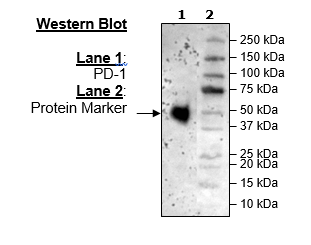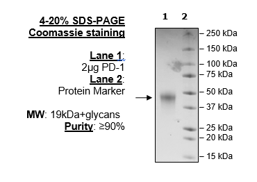 Mouse secreted Programmed Cell Death 1 (PD-1)-Fc fusion protein, also known as CD279, PDCD1, and SLEB2, GenBank Accession No. NM_008798, a.a. 25-167, with a C-terminal Avi-His-tag, expressed in a HEK293 cell expression system. MW = 19 kDa. This protein runs at an apparent higher molecular weight due to glycosylation.