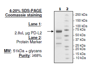 Human secreted Programmed Death Ligand 2 (PDL2)-Fc fusion protein, also known as CD273, PDCDL1G2, and B7-DC, GenBank Accession No. NM_025239, a.a. 20-219, with C-terminal Avi-tag, expressed in a HEK293 cell expression system. MW = 51. Protein function: Involved in the costimulatory signal, essential for T- cell proliferation and IFNG production in a PDCD1-independent manner. Interaction with PDCD1 inhibits T-cell proliferation by blocking cell cycle progression and cytokine production. [The UniProt Consortium]
