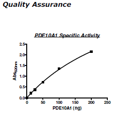 Human PDE10A1 (GenBank Accession No. NM_001130690), a.a. 2-789(end) with N-terminal GST-tag, MW=116 kDa, expressed in Sf9 cells via a Baculovirus expression system. One unit is defined as the amount of enzyme that will convert 1 pmole of 3',5'-cAMP to 5'- AMP per min at 37°C. Assay condition: 10 mM Tris-HCl, pH 7.4, 10 mM MgCl2, 0.05% Tween-20, 200 µM cAMP, and 0.25-4 ng/µl PDE10A1 at 37°C for 20 min. Quantified by 5'-nucleotidase cleaving the 5'-AMP product and releasing the phosphate group which is detected by Malachite Green Reagent. Useful for the study of enzyme kinetics, screening inhibitors, and selectivity profiling. Formulated in 40 mM Tris-HCl, pH 8.0, 110 mM NaCl, 2 mM KCl, 16 mM Glutathione, 3 mM DTT, and 20% glycerol. Stability: >6 months at -80°C References: 1. Gross-Langenhoff,M., et al., J. Biol. Chem. 281 (5), 2841-2846 (2006). 2. Frame,M., et al., Cell. Signal. 13 (10), 735- 741 (2001).