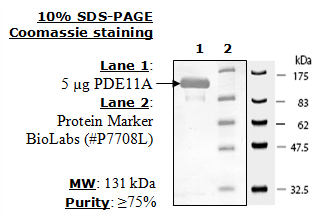 Active human PDE11A4 (GenBank Accession No. BAB62712), full length with N-terminal GST tag, MW= 131 kDa, expressed in a Baculovirus infected Sf9 cell expression system.