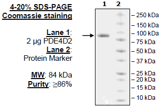 Human PDE4D2 (GenBank Accession No. NM_001197221), amino acids 2-507(end) with N-terminal GST tag, MW=84 kDa, expressed in a Baculovirus infected Sf9 cell expression system. 1 unit is defined as the amount of enzyme that will convert 1 pmole of 3', 5'-cAMP to 5'-AMP per min at 37°C in a reaction buffer. Assay conditions: 10 mM Tris-HCl, pH 7.4, 10 mM MgCl2, 1 mM MnCl2, 200 µM cAMP, 0.1 mg/mlBSA and 0.1 ng/µl PDE4D2 at 37°C for 20 min. Quantified by 5' nucleotidase cleaving the 5'-AMP product and releasing the phosphate group which is detected by Malachite Green Reagent. Application: Useful for the study of enzyme kinetics, screening inhibitors, and selectivity profiling.
