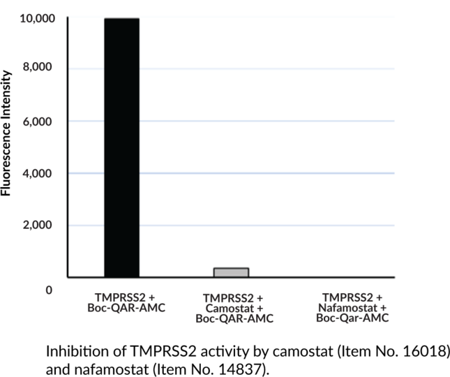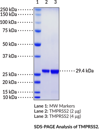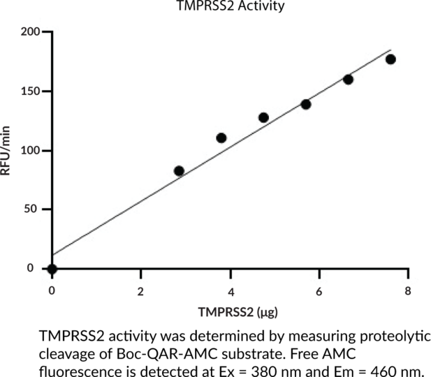 TMPRSS2 is a type II transmembrane serine protease that has major roles in androgen receptor signaling, viral infection, and carcinogenesis. TMPRSS2 is composed of an N-terminal transmembrane domain and an extracellular stem region that contains an LDL receptor class A (LDLRA) domain that binds calcium, as well as a scavenger receptor cysteine-rich (SRCR) domain that interacts with other extracellular molecules. It is synthesized as a zymogen and the C-terminal serine protease domain undergoes autoproteolytic cleavage, releasing the soluble protease into the extracellular space. TMPRSS2 mRNA is mainly expressed in the prostate gland but is also found in the salivary and mammary glands, colon, stomach, small intestine, kidney, liver, and lung. Soluble TMPRSS2 cleaves and activates proteinase-activated receptor 2 (PAR2) in prostate cancer cells. TMPRSS2 facilitates host cell entry of severe acute respiratory syndrome coronavirus 2 (SARS-CoV-2) in vitro, and knockout of Tmprss2 in human dipeptidyl peptidase 4-expressing transgenic mice reduces disease severity in a model of Middle East respiratory syndrome coronavirus (MERS-CoV) infection. Chromosomal translocations leading to TMPRSS2-ERG fusions are associated with prostate cancer. Cayman's TMPRSS2 (human, recombinant) protein can be used for enzyme activity assays.Synonyms: Epitheliasin, PRSS10, Serine Protease 10, Transmembrane Protease Serine 2, Transmembrane Serine Protease 2. Purity: >90% estimated by SDS-PAGE. Source: Active recombinant human N-terminal His-tagged TMPRSS2 expressed in E. coli. Amino Acids: 247-492. MW: 29.4 kDa. Formulation: (Request formulation change), 50 mM Tris-HCl, pH 7.4, with 300 mM sodium chloride and 0.001% NP-40 with 5% glycerol. UniProt Accession #: O15393.